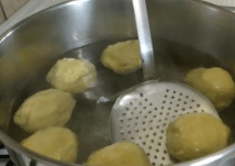 4.Quando l’acqua bolle le palline vanno gettate e ripescate appena vengono a galla, poi messe a scolare su un panno.