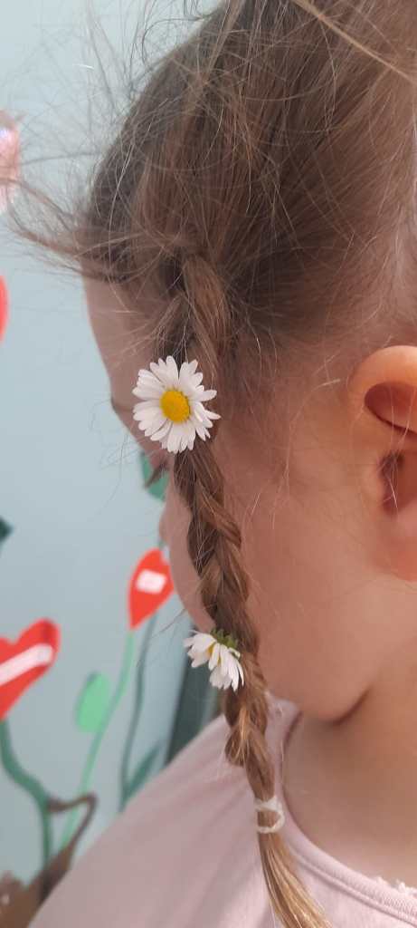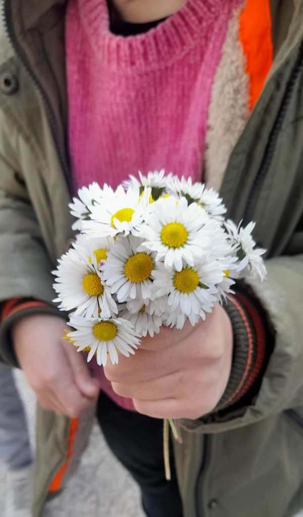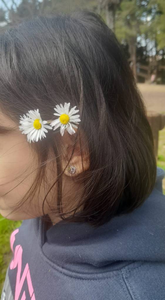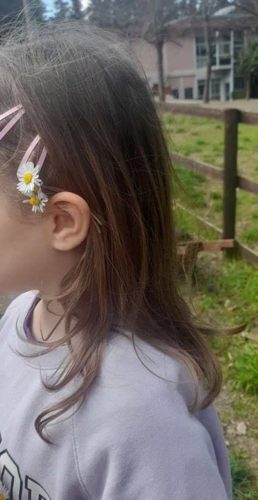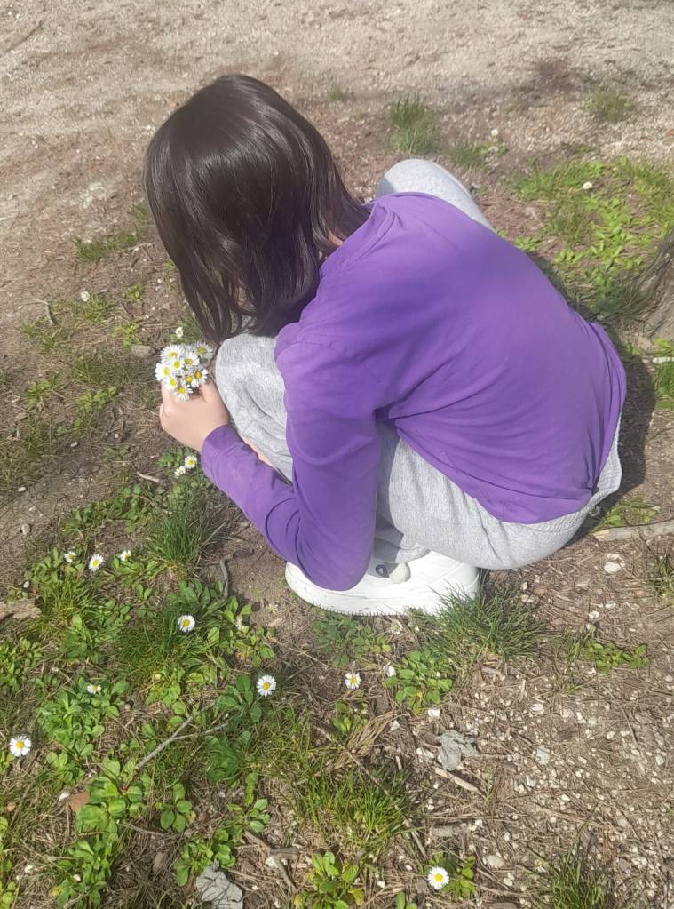 E, a fine giornata,si rilassano giocando con le margherite del prato.